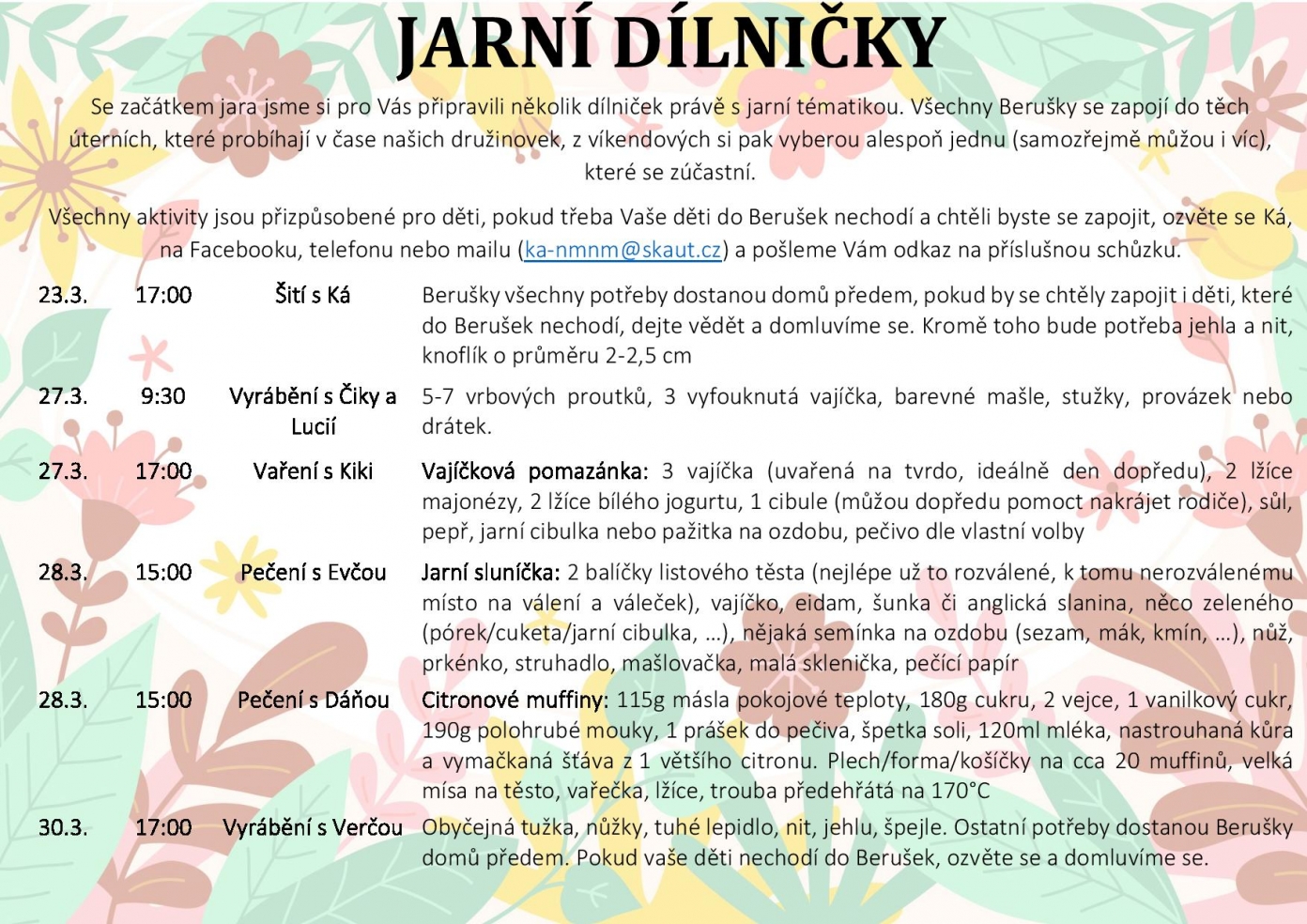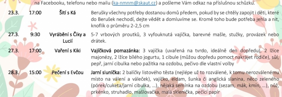 a konec března jsme si pro Berušky i všechny ostatní připravili několik jarních dílniček. Všechny Berušky se zapojí do těch úterních, které proběhnou v čase družinovek. Z víkendových si vyberou alespoň jednu, do které se zapojí.